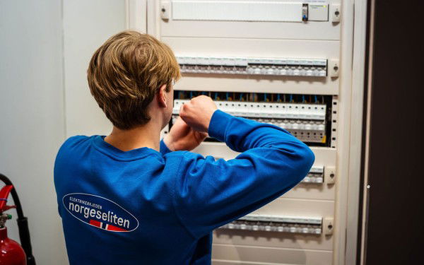 Elektriker fra norgeseliten sitter i trappa og fester en stikkontakt